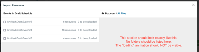 http://elentra-1x-me.localhost/admin/events/drafts?section=edit&draft_id={your_draft_id}The service account email you entered on Box.com in the share modal will automatically accept the invitation, and you will receive an email in your admin account that informs you of this. Next, if you once again navigate to the "Import & Export" option in Elentra's interface, then select "Import Resources", you should again see the "Import Resources" panel, however this time you should see your Box.com folder that you shared, accessible in the righthand side of the panel.